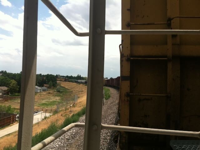 We found the park, nice and grassy and with a mound that afforded a view of the yard and the Rocky Mountains beyond. The hole in the fence, surprisingly, was still there. We didn’t go through it yet, because we didn’t need to: the fourth track was empty. We waited. And waited and waited and waited. We bought cans of beer a couple of blocks away and waited some more. “This is what riding the rails is really like,” I said.