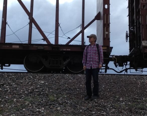 Trains started rolling in. There was plenty of traffic but few places to ride: in the 20 years since my last hop, the rolling stock has changed. Almost all boxcars now have their doors closed and locked. Automobile carriers have doors on the end that prevent one from climbing up and entering the top floor, which the old design allowed. More and more freight trains are intermodal, meaning that their cargo is solely containers, off-loaded directly from ships: the big metal boxes sit on special flatcars, most with nowhere to ride. We watched as two westbound intermodal freights, and one eastbound, stopped in front of us for their crew changes—we the remoras, they the big sharks. Only one of the flatcar configurations, the 48-footer, has a safe spot for riding: a recessed compartment, or well, at one end. The last time I’d been in one, in Spokane around 1990, my companion and I had been discovered by a railroad special agent, who took down the info on our IDs and said he’d arrest us if he saw us again. I didn’t tell Asa that.