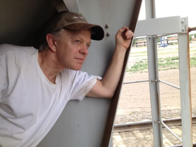 Late in the afternoon, the clouds hung heavy and dark. A few beams of light shot through for brief periods, a fabulous light show. But then the holes closed up and the clouds burst. We stuffed our gear into the opening in the grainer’s frame and pressed ourselves in as far as we could go, succeeding in staying mostly dry. “I’m glad we didn’t find a flatcar to ride on,” I said. “We’d be soaked.”